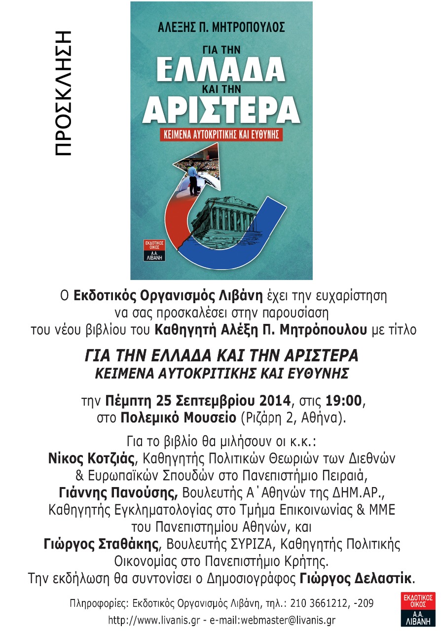 15. «Στο Έλεος του Μνημονίου. Η πολιτική της χρεοκοπίας και η υπέρβασή της», Εκδοτικός Οργανισμός Λιβάνη, Αθήνα 2012.